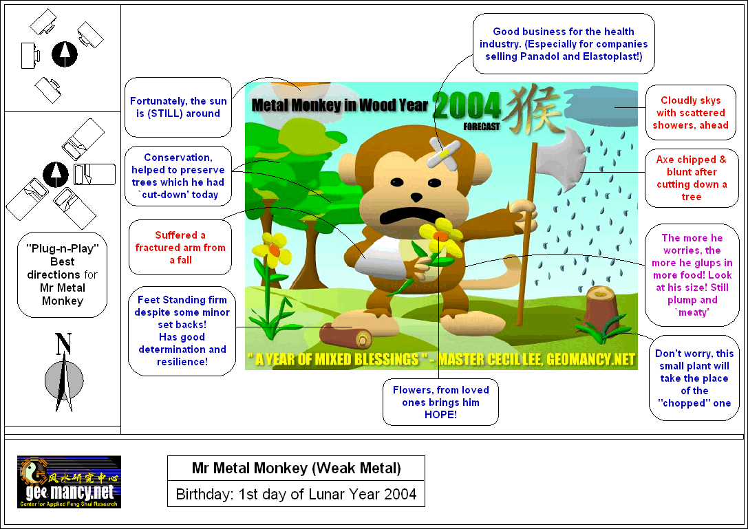 2004 is the Year of Monkey, where the Heavenly Stem of the Year is Wood while Earthly branch is Metal. When Metal Monkey attempts to chop tress, the monkey has both gains and injuries. So some difficulties can be expected.Learn more about what Cecil has to say about this illustrated forecast!
